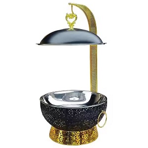 Serve in style with this elegant ,Orient Chaffing dish, designed for sophisticated presentation and efficient heat retention. Featuring a detachable stainless steel bowl, laser-cut decorative stand, and a bold dome lid, this piece is ideal for buffets, events, or fine dining. The arched stand with gold detailing adds a luxurious touch, while the wide base ensures stability and heat-safe use.